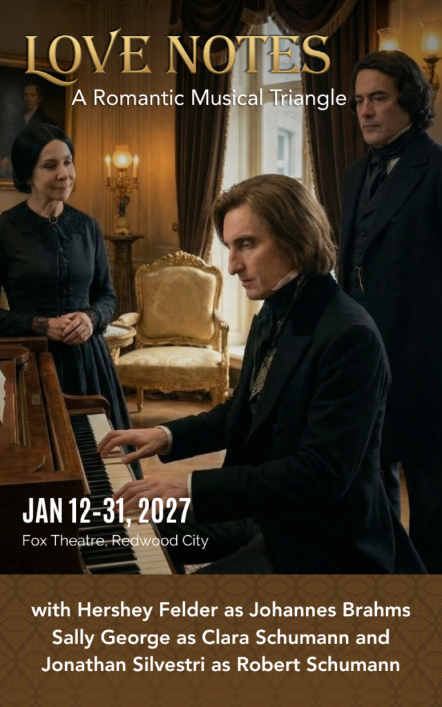 1853, Dusseldorf, Germany. A young Johannes Brahms steps into the orbit of musical giants composer Robert Schumann and his wife, pianist and composer Clara Schumann. Brahms plays for the Schumanns and Robert declares him “a genius, the new Beethoven.” One year later, Robert Schumann descends into madness and commits himself to an asylum. The young lionlike Brahms remains by Clara’s side to help her and the Schumanns’ seven children and falls deeply in love, yet Clara remains eternally devoted to her husband. What happens between them all is a romantic story for the ages written in sound. With Hershey Felder as Johannes Brahms, Sally George as Clara Schumann, and Jonathan Silverstri (Rachmaninoff and the Tsar), as Robert Schumann, Love Notes features a story of passion, longing, and love that led to some of the most beautiful music ever composed.